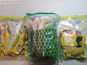 Jaký systém ukládání zbytků máte? Můžete efektivně ukládat zbytky tak, abyste se v nich vyznali a mohli je používat? Můžete použít třeba průhledné krabice, ale ja začala používat velké zipové sáčky, které pokud nejsou plné nezabíraji tolik místa. Pokud budete mít zbytků hodně, můžete i tvary třídit podle barev. Skladování vám usnadní prohlížení a uchovávání zbytků podle potřeby. To vám umožní nejdříve prohlédnout zbytky než půjdete nakupovat na další projekt.