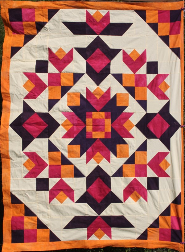 Deka šitá z ručně batikovaných látek doplněná o jednobarevnou látku. Velikost cca 150 x 190 cm. Cena se odvíjí podle zadní strany quiltu a použité výplně. Uvedená cena je průměr a může se lišit podle výběru o maximálně 15% navíc.